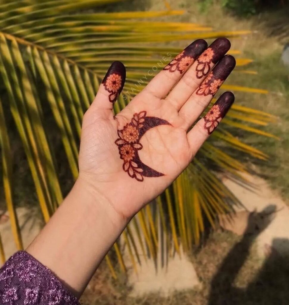 A net-style jaali across the palm with flowers on the corners is neat and trending.