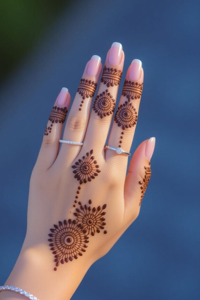 This style is highly searched on platforms like Google, Pinterest, and Instagram under keywords such as “tiny flower mehndi,” “small floral finger mehndi,” “easy flower henna,” and “minimal finger mehndi design.” It is perfect for beginners because the motifs are small and easy to draw, requiring only a steady hand and a fine mehndi cone. The Tiny Flower Finger Design works beautifully for Eid, weddings, dholki nights, casual parties, college events, and kids’ mehndi. It can also be combined with other minimal patterns like dot chains, leafy bails, and mandala fingertips to create a more complete hand design without overwhelming the look.